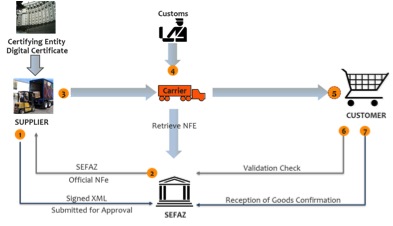 - 自2012年4月起,接收方必须与SEFAZ验证入站NF-e。退回的批准代码必须纳入买方提交给政府的月度会计报告中。通过强迫买方验证,政府可以毫无疑问地确保,不仅商品匹配,而且价格和税收也匹配。第二次验证消除了政府的税收泄漏。