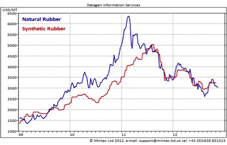 由于中国和美国这两个世界最大的经济体(也是两个最大的橡胶消费国)经济状况疲软,世界天然橡胶和合成橡胶的价格最近回到了2012年大部分时间的下降趋势。2012年,东南亚主要橡胶生产国的产量预计将增长5%,达到1083万吨,这给天然橡胶带来了压力。该地区占全球天然橡胶供应的92%。目前,泰国和马来西亚的天然橡胶价格同比均有所下降,较2011年初的峰值大幅下跌。