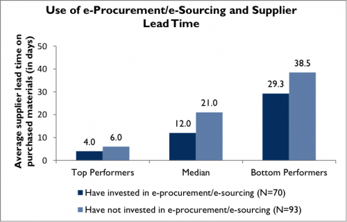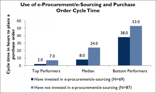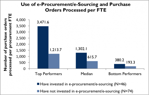 此外,随着电子采购系统的使用,每名采购全职等值员工(FTE)处理的采购订单数量显著增加。如下图所示,与没有这些系统的同行相比,使用电子采购系统的最佳绩效者每次采购FTE处理的采购订单超过2000个。