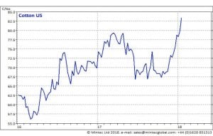 美国棉花价格一直在2017年的一个过山车,结束在高。去年4月,我们看这是否可能是棉花价格高企的终结吗。我们的结论是,是的,棉花价格应该下降最新数据显示美国棉花种植面积上升了2017/18赛季。我们的预期成为现实,全年价格下跌,直到最近,当11月以来棉花价格上涨22%,达到2014年的水平高。