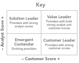 - 价值的领导人提供高于平均平均分析师和客户分数(右上象限)的提供商。