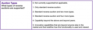 - 供应商根据0-5的标准评分等级进行自我评分(如果供应商根本没有这种能力,则为0)。请看下面的例子;在这种情况下,如果解决方案支持的反向拍卖类型不包括至少两种额外类型(例如,Yankee, Dutch),供应商将不会得到2或更高的分数: