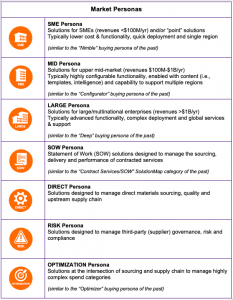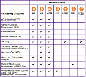 自SolutionMap成立以来,Spend Matters应用了一套“购买角色”来创建可变排名。这本质上是应用于数据的过滤器,以强调不同购买组织原型的独特需求(例如,Nimble角色典型地代表了快速增长的中小型公司,寻求低成本、直观、快速实施解决方案),以说明Spend Matters的能力,使不同的数据削减,以适应不同的终端用户购买组织的需求。