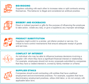 采购欺诈可以有多种形式,从串通投标到供应商道德规范。以下是一些最常见、最具破坏性的不道德采购行为: