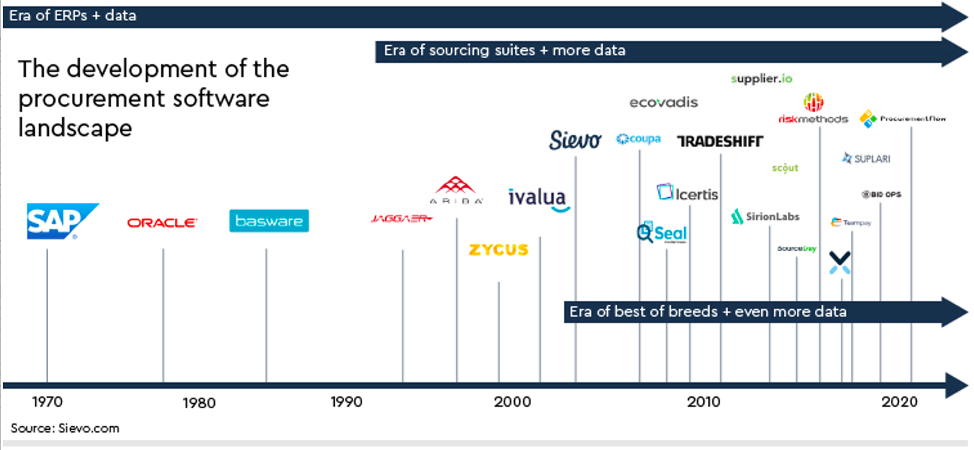 下图展示了从ERP套件到S2P套件再到最佳解决方案生态系统的数据爆炸。一些企业和采购软件的基础已经达到了50年的服役年限。即使在Sievo在美国,我们最近庆祝长大成人18岁的时候启动。虽然采购软件市场的成熟需要一段时间,但很明显,近年来采购数字化的步伐已经加快。出现了许多新的服务提供者,以满足采购组织广泛的需要。