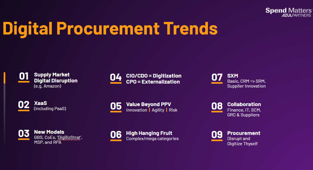 前九个趋势(上)反映了与战略相关的发展,但是在网络研讨会中的第二张幻灯片中排名第12,这列出了技术最终解决的战术,长期问题 - 这就是控制尾部构成管理的。(With greater visibility into tail spend and better payment options, you could control more of the nearly 30% of spend that isn’t managed. As Spend Matters analysts have pointed out, if you could cut 30% of your spend by 30%, that's a 9% cost reduction that could go straight to the bottom line.)