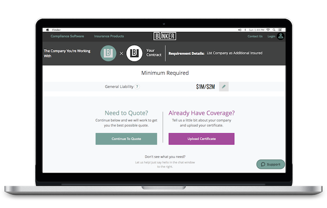 地堡将保险验证、监控和执行整合到一个平台中,为独立专业人员和参与他们的公司简化了流程。我们的会员(企业、MSPs、人力资源公司、市场等)在Bunker平台中制定保险要求,并与承包商、供应商和供应商分享,他们可以选择上传COI或从Bunker购买保险权利(在最短的两分钟内)。