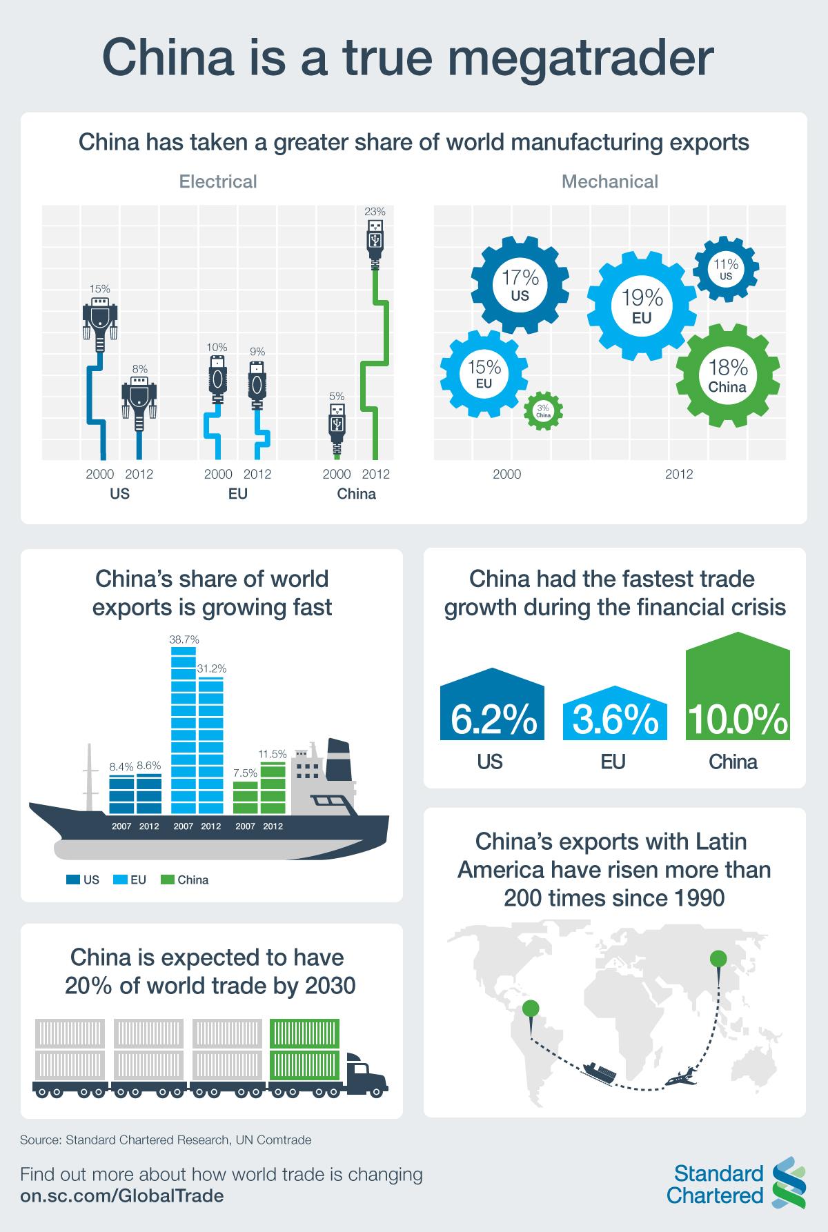我认为,渣打银行(Standard Chartered)制作的图表仅用一些趋势数据显示了中国贸易的庞大规模,就可以正确地看待中国的贸易流动如何在世界各地产生如此大的影响。2013年,中国商品进出口总额达4.16万亿美元,首次超过美国。